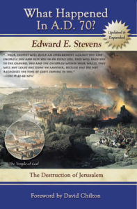 WHAT HAPPENED IN A.D. 70? By Edward E. Stevens – Now available in its sixth edition, with significant enhancements and a new cover design. It shows the historical fulfillment of the first century Return of Christ. The Matthew 24-Luke 17 chart, list of fulfillments in Josephus, chart on the intensification of the TIME statements in the last NT books, plus the annotated bibliography of preterist writings make this short book “a good basic introduction” to the Full Preterist view (Walt Hibbard). It affirms the completion of all NT books by the time Jerusalem was destroyed in AD 70. There are both a printed edition and an electronic edition of the book available. Only 64 pages.